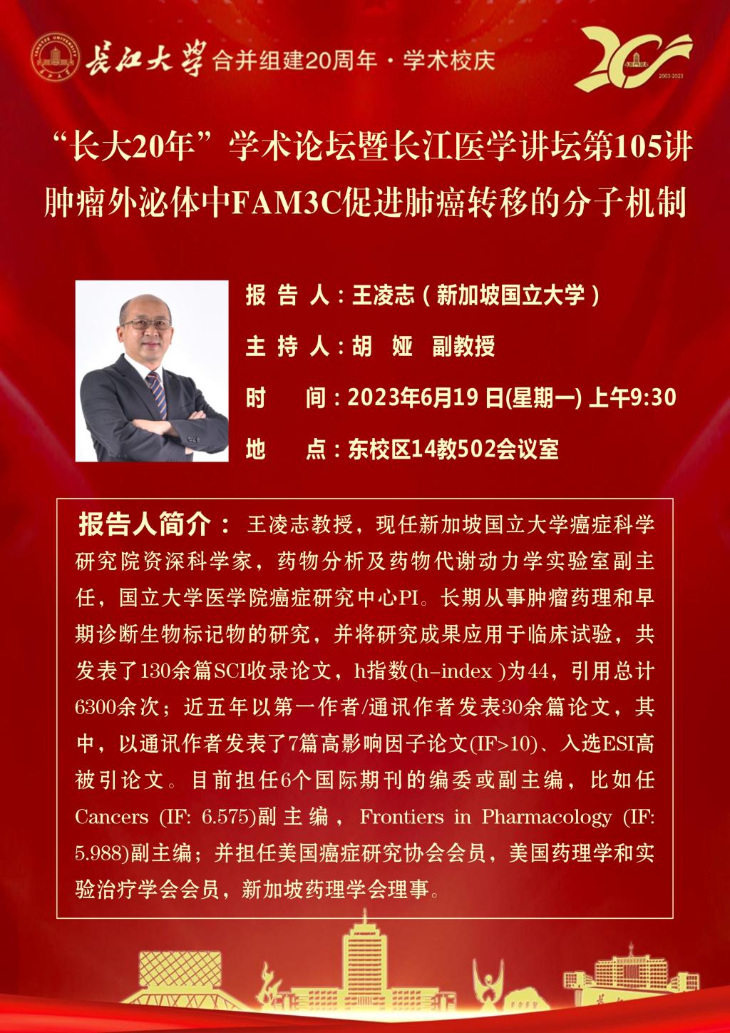 长江医学讲坛(第105讲):肿瘤外泌体中FAM3C促进肺癌转移的分子机制