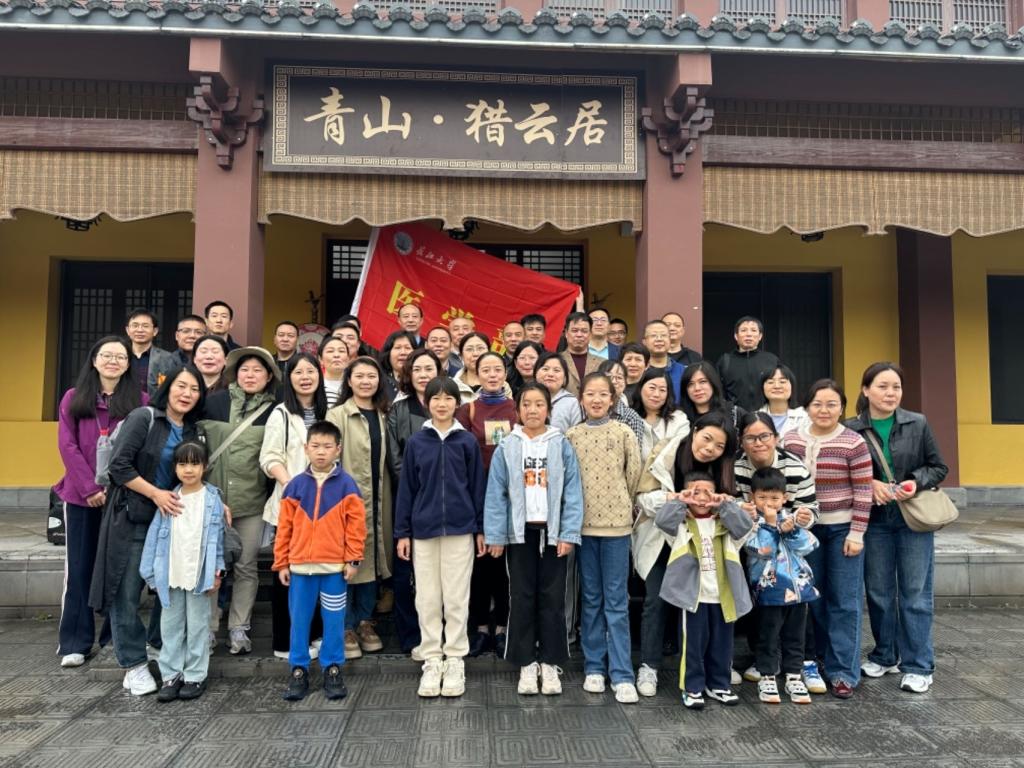 上午8:40,在医学部领导及分工会负责人的带领下,全体教职工经过40多分钟的车程来到了此次踏青目的地“青山村”,大家首先在青山猎云居大门前合影。