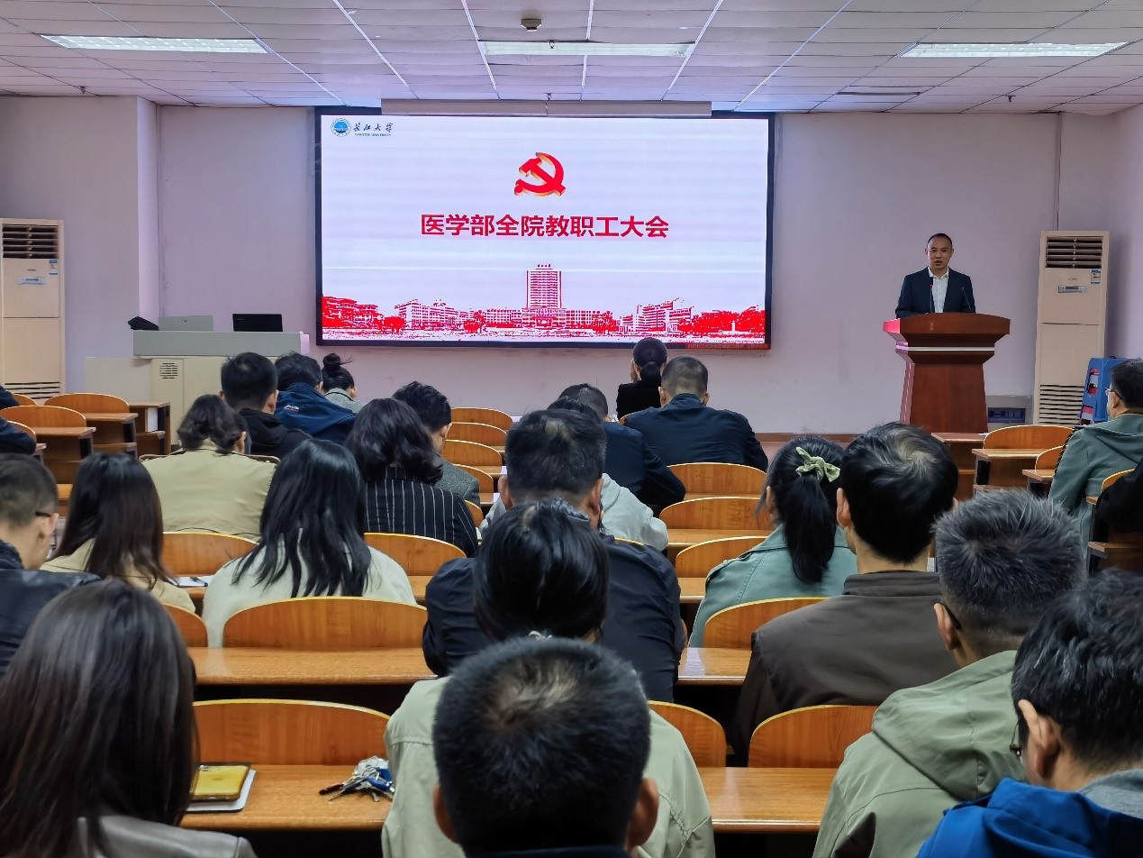 10月19日下午,医学部于14教南410会议室召开2023年10月全院教职工大会暨教职工政治理论学习会议。会议由医学部党委书记黄群俊主持,全体教职工参与此次会议。