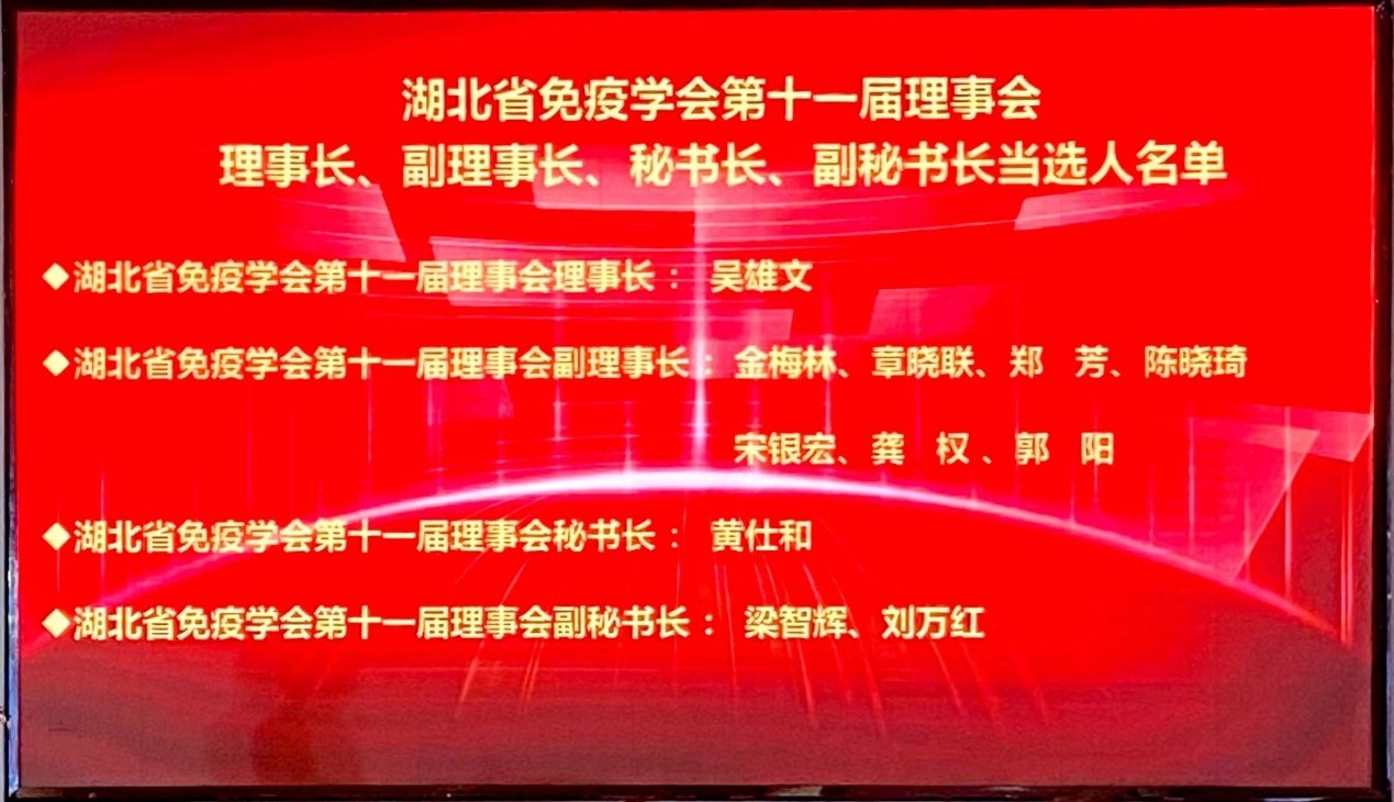 湖北省免疫学会成立于1986 年11 月,业务主管单位为湖北省科学技术协会,属于省级一级学会,挂靠单位为原同济医科大学,现华中科技大学同济医学院。本次大会共有来自华中科技大学同济医学院、武汉大学医学院、华中农业大学、武汉科技大学医学院、长江大学医学部、三峡大学医学院、江汉大学、湖北文理学院、湖北医药学院、湖北民族大学医学院、武汉生物制品研究所,以及合作医院与企业等490多位代表参会。会议审议通过了上一届湖北省免疫学会的工作报告,选举产生了新一届湖北省免疫学会理事会,吴雄文当选为湖北省免疫学会第十一届理事会理事长,金梅林、章晓联、郑芳、陈晓琦、宋银宏、龚权、郭阳当选为副理事长,黄仕和为秘书长。