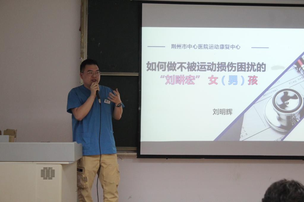 刘明辉老师带来主题为“如何做一个不被运动损伤困扰的‘刘畊宏女(男)孩’”的讲座,刘老师从运动损伤的发生,以及如何治疗进行了详细的讲解,语言风趣幽默,通俗易懂。