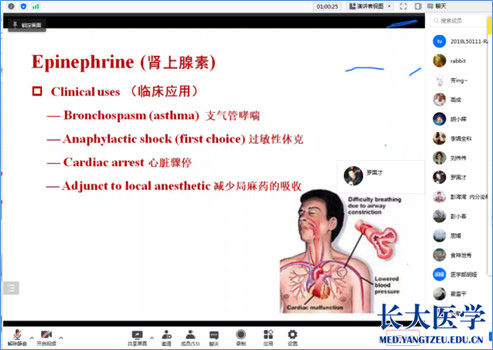 本次示范课由基础医学院刘珍珍老师主讲,刘珍珍老师为2019Fall班级同学讲解了Adrenergic Pharmacology(肾上腺素的药理作用)、Epinephrine Clinical uses(肾上腺素的临床应用),集中解释了其在Bronchospasm(asthma)支气管哮喘、Anaphylactic shock(first chice)过敏性休克、Cardiac arrest心脏骤停等多种疾病中的应用。