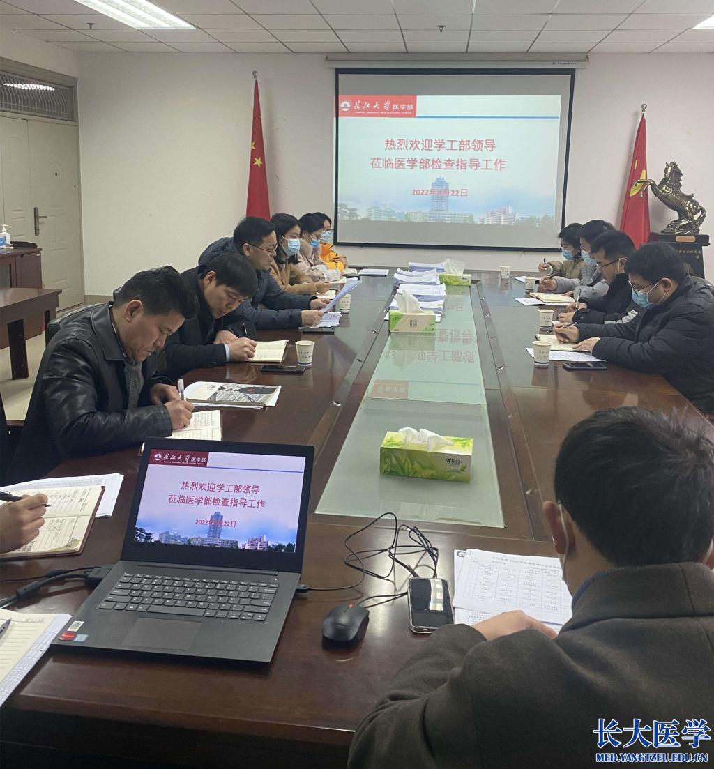(通信员黄柏青)3月22日中午11点,长江大学党委学工部部长徐波一行4人到医学部检查学生工作。医学部党委副书记张文君首先汇报了学生返校基本数据;印刷、签发《长江大学2022年开学安全责任告知书》;学生疫情防控管理;六类重点人群谈心;2022届毕业生就业;特困生资助与帮扶;未满5年辅导员入住学生宿舍、参与枫桥服务;考研基本数据与毕业年级外语成绩;年级辅导员参与学生宿舍安全卫生检查以及医学部学生在外住宿等情况。医学部党委书记关辉向徐部长介绍了进一步做好医学部学生工作的思路和意见,并就进一步优化协同医学部和两个临床医学院学生事务管理工作进行了探讨交流。