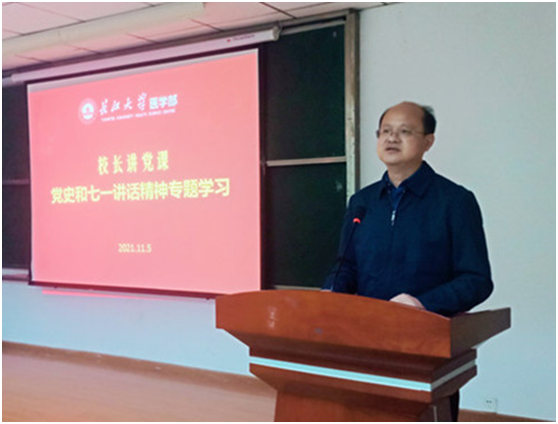 为扎实推进党史学习教育深入开展,11月5日上午,副校长毛精华围绕学习贯彻习近平总书记“七一”重要讲话精神,为医学部全体教职工、部分学生党员代表讲了一堂生动的专题党课。