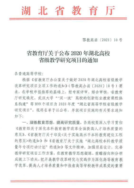 (通讯员 胡艳红)近日,湖北省教育厅印发了《省教育厅关于公布2020年湖北高校省级教学研究项目的通知》,医学部共获批3项,创历年获批数量新高。