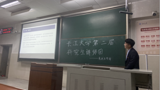 (通讯员 范浩)2021年4月12日晚19时,长江大学第二届研究生讲师团成员法学院赵世纪同学,在主教108进行了主题为“绿水青山看中国”的宣讲活动。医学部全体在校研究生参加宣讲会。