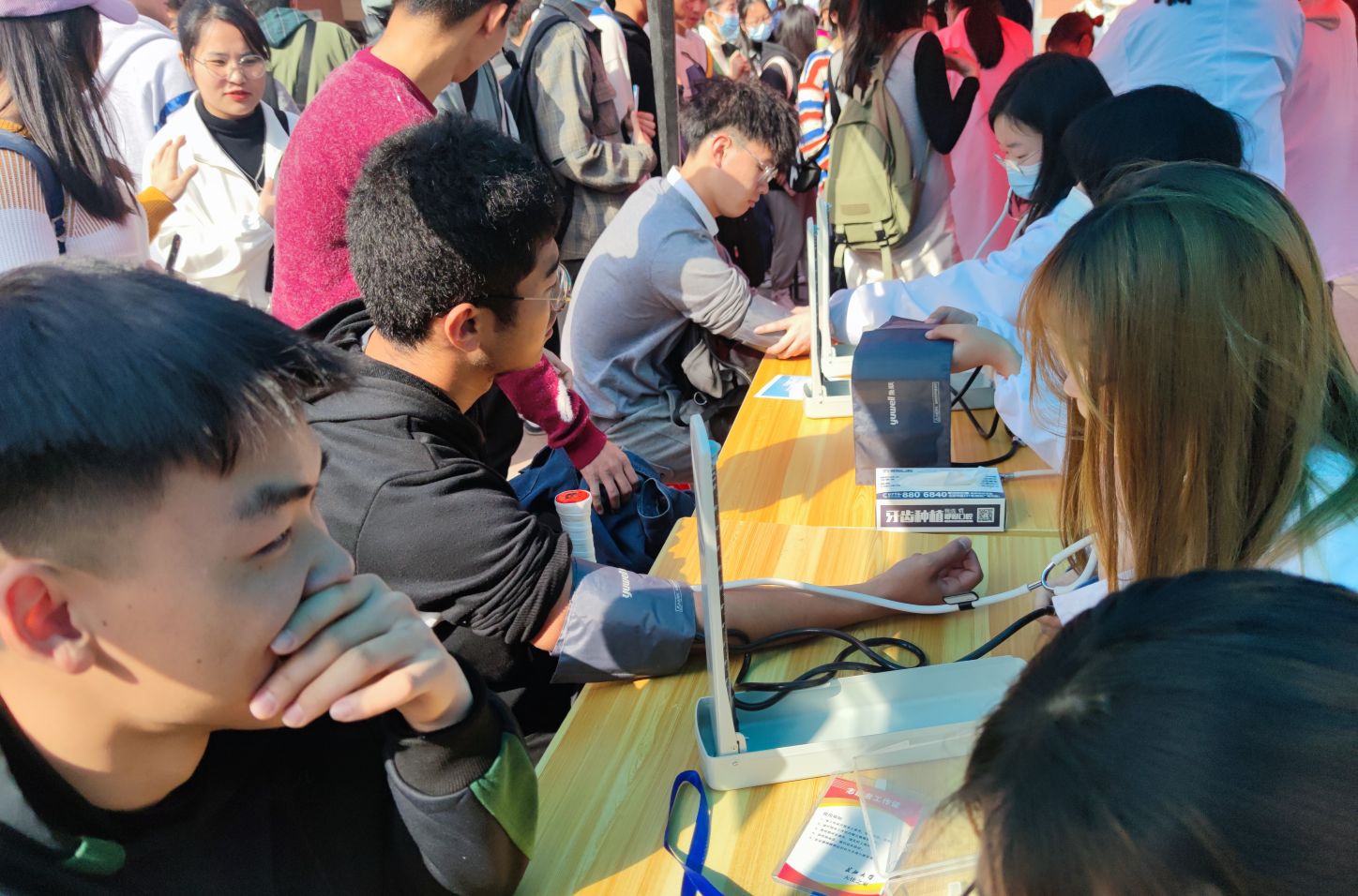 此次义诊包括血压测量,推拿按摩,视力检测,口腔健康知识等项目,同时为确保活动的权威性,邀请了专业医生进行坐诊,设立了华夏眼科专家坐诊区、咿呀牙科专家坐诊区。义诊期间测量区的医护人员会将检测结果以及相关注意事项告知同学们;推拿区的队员耐心地给同学进行推拿按摩并向他们普及一些常见的穴位,活动现场气氛热烈,同学们参与的积极性非常高。