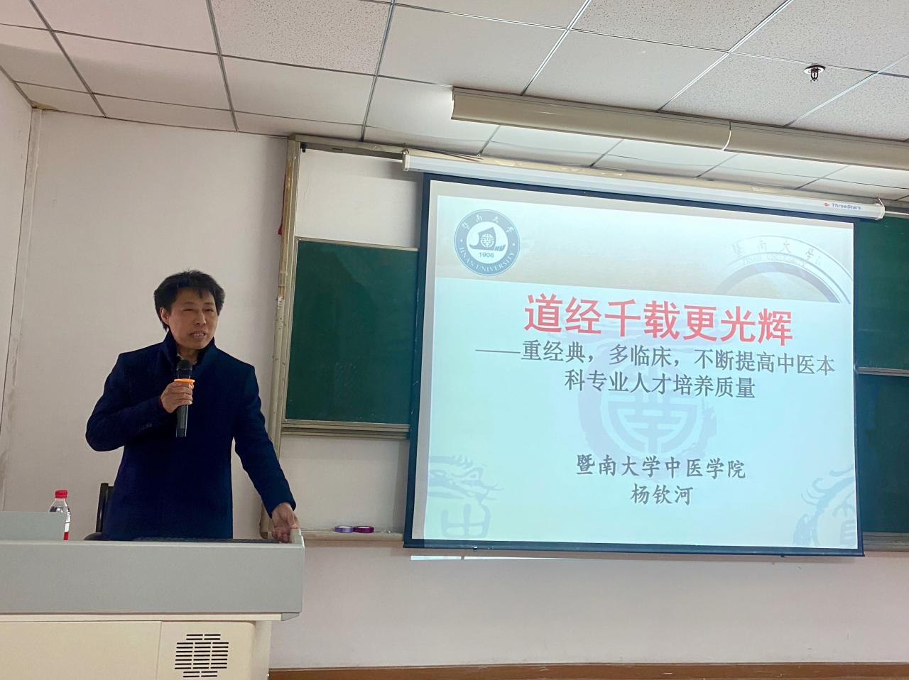 (通讯员:王喆) 为进一步提升医学部人文素质教育水平,加强医德医风建设,12月3日,长江大学医学部特邀暨南大学教授、博士生导师、第六批全国老中医药专家学术经验继承工作指导老师杨钦河教授,以“道经千载更光辉——重经典,多临床,不断提高中医学专业人才培养质量”为题进行讲座。本次讲座由健康医学院院长黄江荣主持,医学部党委副书记张文君,中西医结合系主任李孝林,教师代表潘丰满,以及医学部全体中西医临床专业学生参与。