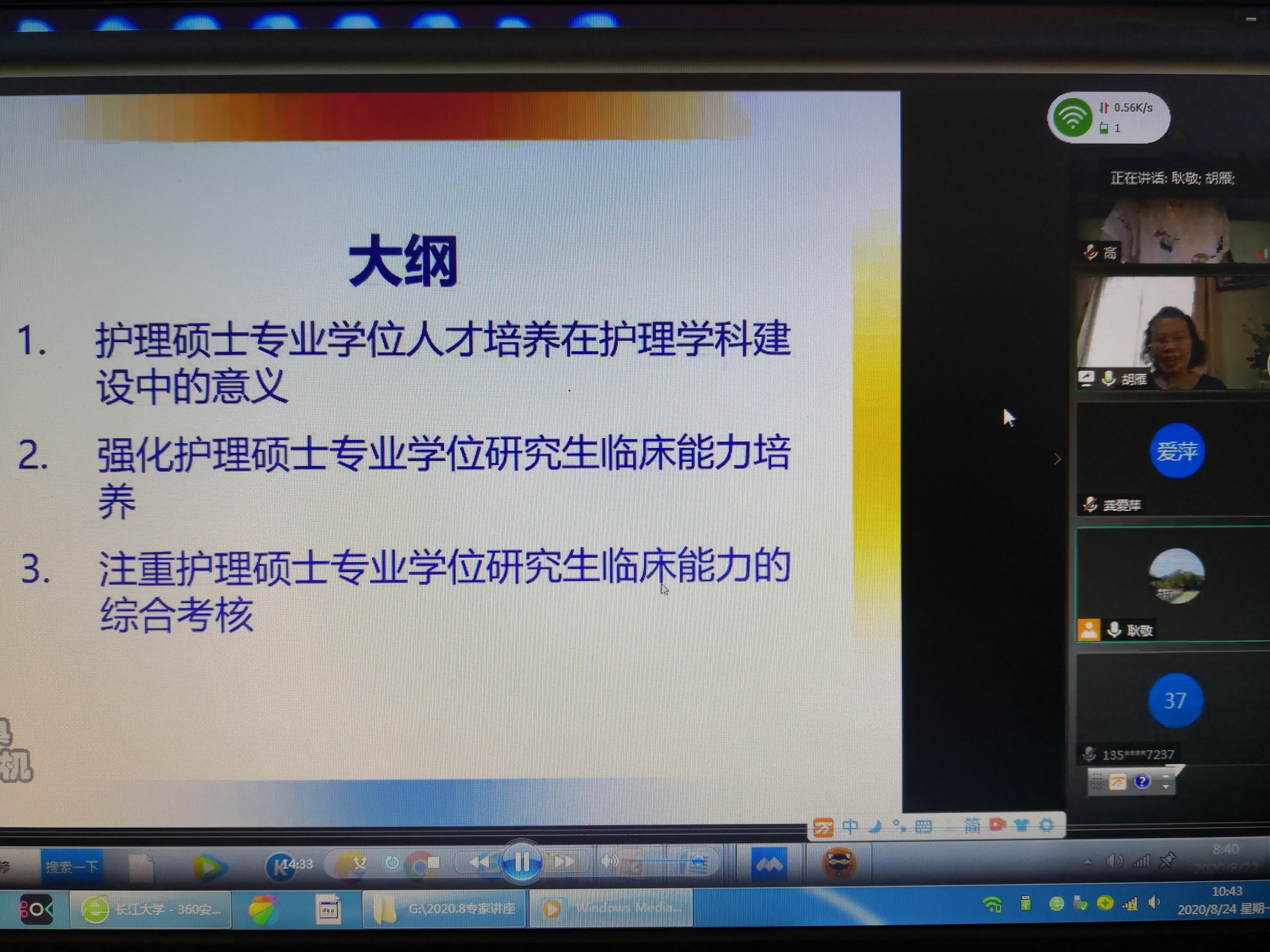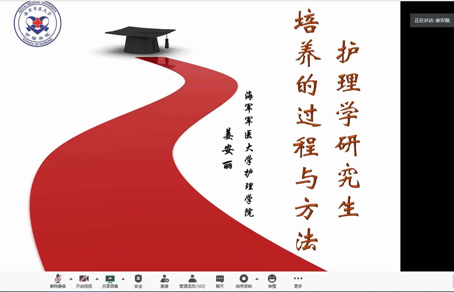 (通讯稿 耿静 )2020年8月22日上午8:30,医学部以腾讯视频会议的形式邀请复旦大学胡雁教授、中国人民解放军海军军医大学姜安丽教授为医学部护理硕士专业学位研究生导师作专题讲座,医学部护理专硕导师、护理系全体教师、长江大学护理硕士研究生各实践医院导师以及临床实践指导教师参加了本次专题讲座,网上参会人数近120人。本次专题讲座由医学部领导胡娅副院长主持。