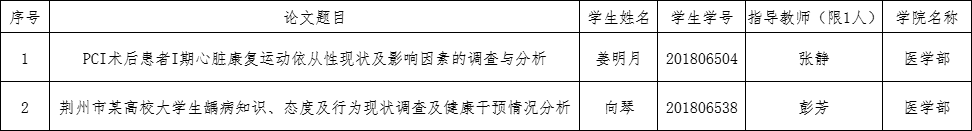 根据长江大学教务处《关于组织评选2022年校级优秀学士学位论文的通知》[长大教通字(2022)12号]要求,结合学部实际,医学部认真组织了2022届优秀学士学位论文评选工作。经过护理学专业答辩推选、学部优秀学士学位论文评选小组推荐、学部学位评定委员会集体研究决定等环节,从今年参加毕业答辩的本科毕业设计(论文)中筛选了2篇优秀论文,拟推荐为长江大学校级优秀论文,现按规定予以公示。