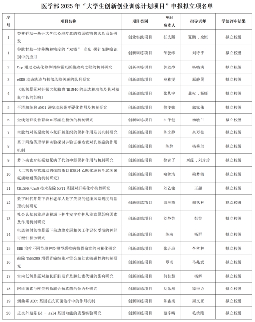 2025年医学部学生共申报大学生创新创业训练计划项目49项,经过学生汇报答辩、专家评审,拟推荐邹骏纬负责、刘诗宇老师指导的《谷胱甘肽—转移酶和粘度的“双锁” 荧光 探针在肿瘤识别中的应用》等21项申报校级大创项目。具体名单如下: