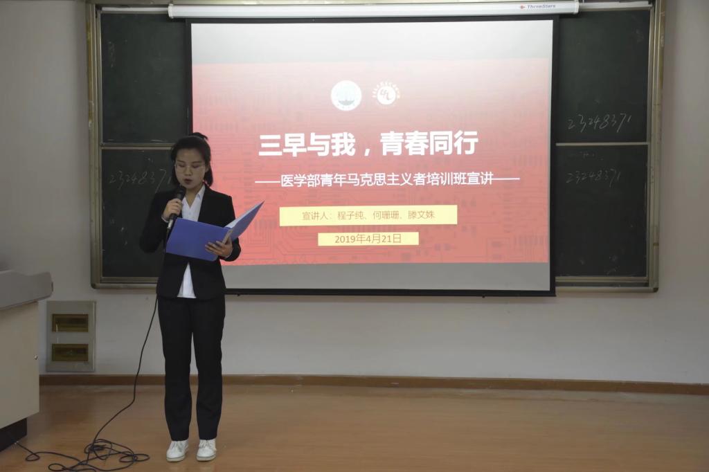 (通讯员:杨甜 潘俞彤)2019年4月21日星期日下午7点,医学部在14教410顺利召开青年马克思主义者培训班关于“三早”宣讲活动,参加本次活动的有医学部党委副书记张文君、辅导员王乾老师以及医学部18级学生。