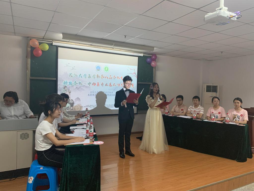 (通讯员:邓韬 邓庆怡)2019年5月29日晚七点,医学部第八届杏林文化节中西医专业基本功大赛决赛于14教南410学术报告厅成功举办。医学部副部长黄江荣、党委副书记张文君、副教授李孝林莅临比赛现场。比赛评委老师由荆州市中医医院主任医师邵治国、主任医师桂壮,医学部副教授潘丰满老师担任。中西医临床专业学生共同观看了本次比赛。