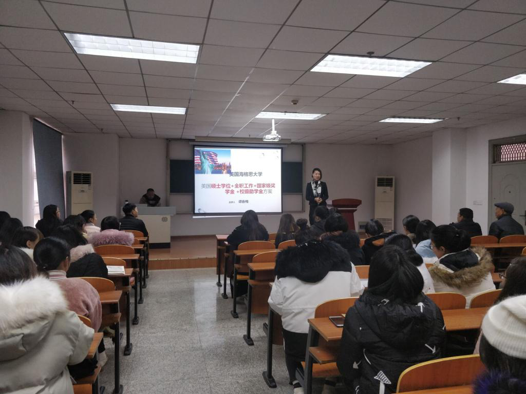 谭春梅老师首先介绍了美国海格思大学护理专业的发展前景以及美国目前急缺护理专业人才的现状,随后详细解读了学校针对海外学生的帮扶和资助政策。比如学生家庭经济情况不太好,学校支持学生在学习以外的时间做兼职并介绍工资较高的工作,其工资基本可满足日常生活,并且学校每年也会有可观的奖助学金发给符合条件的学生。对于英语口语能力欠缺的同学,学校会开展入学前英语口语学习培训,直至学生考试合格为止。最后,谭老师播放了美国海格思大学的介绍视频,让同学们更直观的了解到了美国海格思大学的实力和环境。