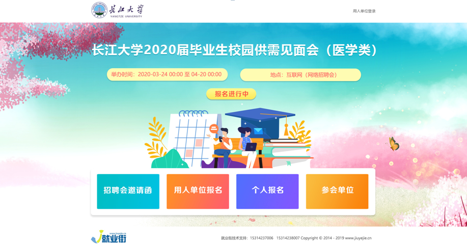 (通讯人 杨佳 孟鑫)2020年3月24日至4月20日,由长江大学医学部学工办协手“就业街”网站搭建的用人单位与毕业生双向选择平台,进行了为期28天的用人单位招聘和毕业生求职的线上网络双选活动。