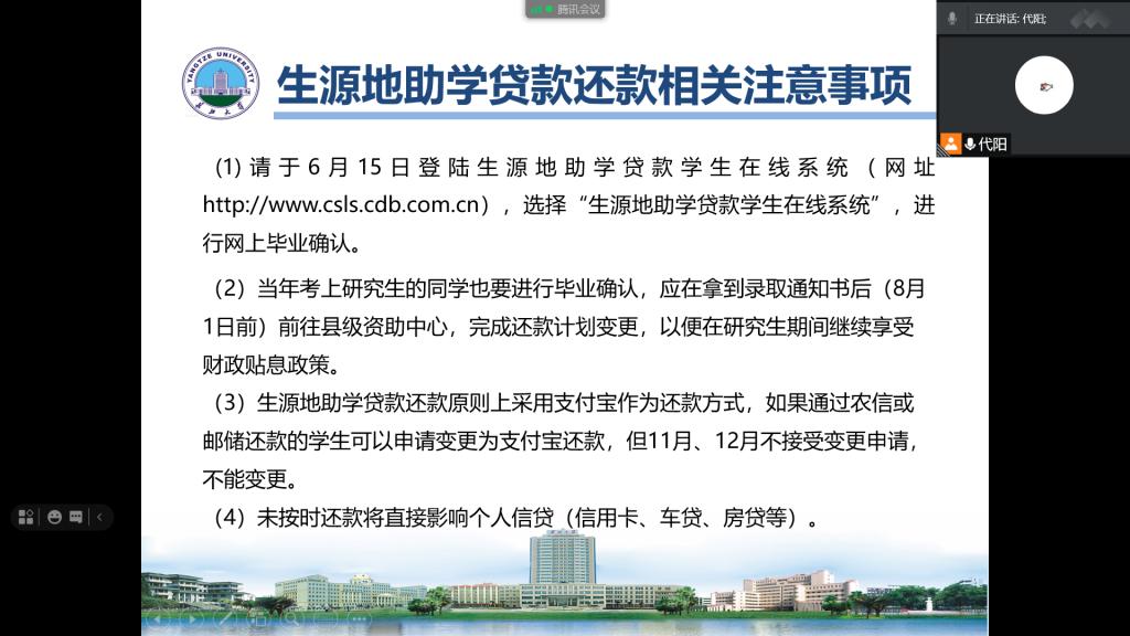 针对不同的年级,医学部开展了侧重不同的诚信主题教育活动。18级辅导员王乾老师组织大三年级35名班干部于6月9日开展了资助育人政策专项培训工作。培训内容包括每月资助工作重点、家庭经济困难学生认定程序、各类奖助学金介绍和生源地助学贷款四个方面。通过此次培训,各班班干部对我校资助工作内容、形式和要点有了细致的了解和认知。针对办理了生源地助学贷款的63名毕业生,毕业年级辅导员代阳老师组建了毕业生贷后管理工作群,并通过腾讯会议线上讲解了毕业生还款流程、还款方式、还款时间及相关注意事项,并强调了个人信用的重要性,提醒学生务必按时按要求进行还款。