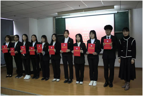 张文君老师宣读结业及表彰文件,以刘瑶为首的53名学员满足结业条件并授予李思琪等10名学员优秀学员称号。随后,由校团委副书记张娟老师颁发证书并合影留念。