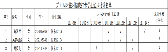 根据疫情防控形势以及学校要求,医学部一直实行每日健康打卡制度,在第11周(2021年11月8日-11月14日),经年级辅导员、学工助理、班干部多次提醒,仍有曹涵哲等3名学生未在规定时间内完成打卡,具体未打卡日期及次数如下: