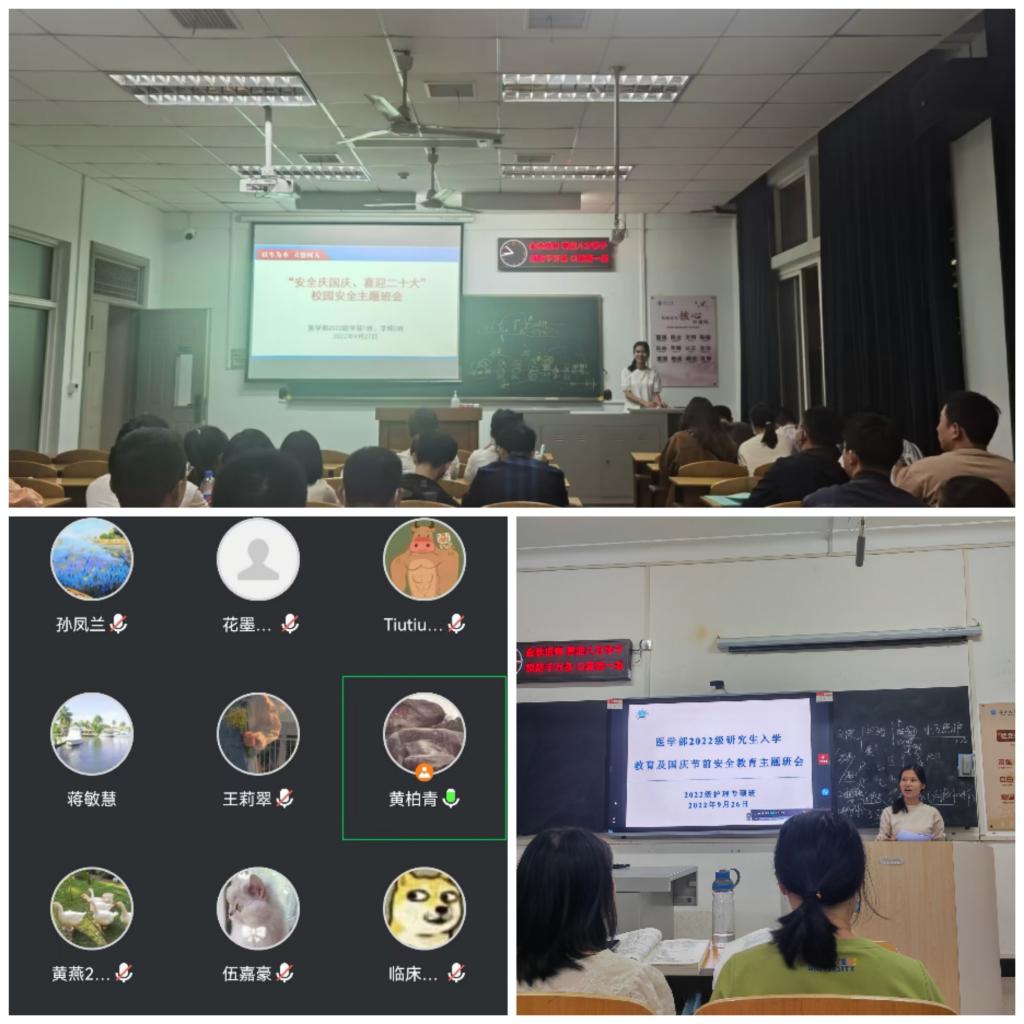 (通讯员:黄柏青 刘伟)为帮助2022级研究生尽快熟悉校园环境、适应校园生活,开学以来医学部领导深入寝室,慰问走访新生宿舍,切实听取和解决同学们现实困难和诉求。根据近期疫情防控形势和学校要求,9月11日、26日和27日,医学部以班级为单位组织逐一开展了2022级研究生入学教育主题班会以及国庆节安全教育主题班会。