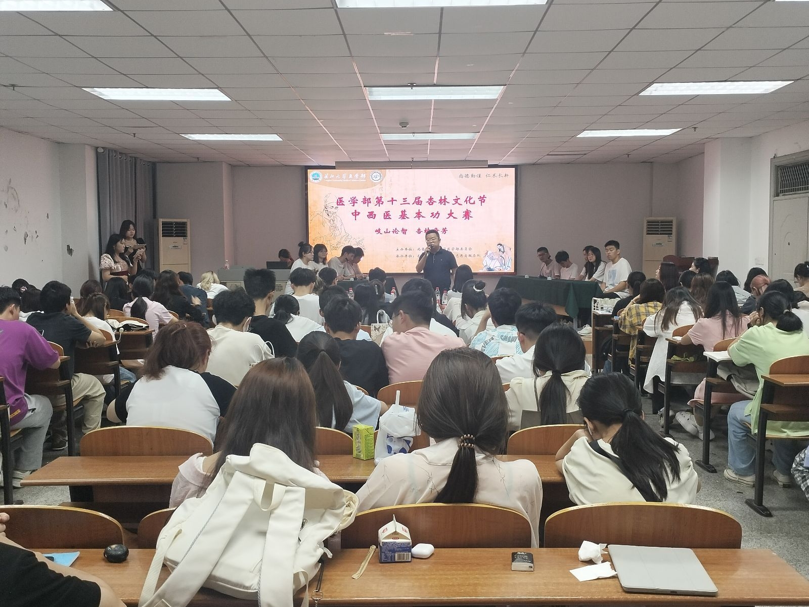 (通讯员:匡敏 齐俊杰)岐山论智、杏林争芳,医学部于2024年6月2日晚七点在14教南410学术报告厅举办“第十三届杏林文化节·中西医基本功大赛”决赛。担任本次决赛评委老师有:荆州市中医医院肾病科主任邵治国、长江大学医学部中西医结合系主任李孝林、中医临床教研室主任李都、中医经典教研室顿晶晶;莅临本次比赛的嘉宾有医学部党委副书记张渊。同时2023级中西医临床专业学生全员观摩本次大赛。
