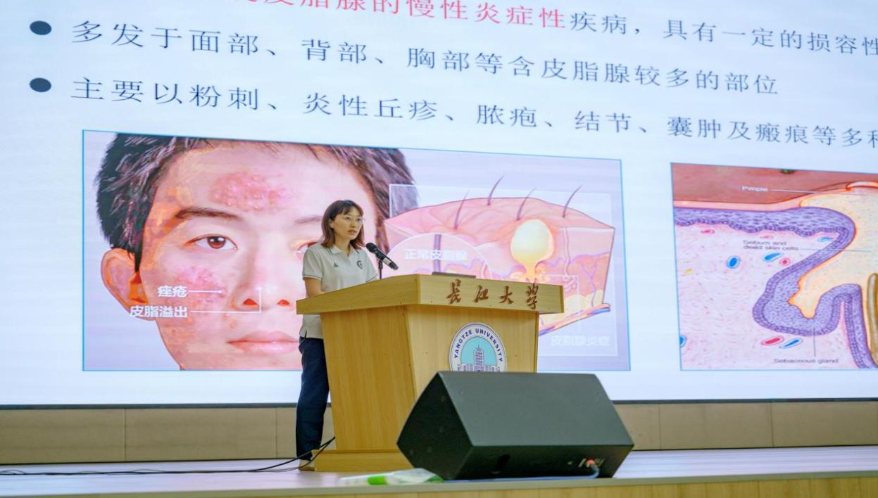 随后,针对大学生常见健康问题,来自荆州市中心医院的三位医师分别开展了科学护肤与痤疮防治、颈椎病与腰椎问题的成因、干眼症防治健康科普讲座。