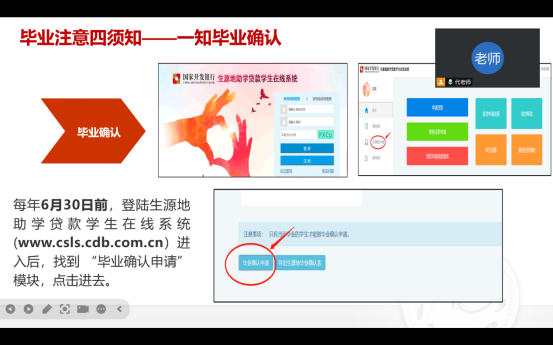 毕业年级辅导员代老师通过线上的方式,为毕业生深入讲解生源地信用助学贷款还款流程。从还款时间节点、还款方式到提前还款手续办理,进行了细致入微的说明,确保每一位贷款毕业生都能清晰掌握还款要点。同时,结合典型案例,强调贷款违约的严重后果,进一步加强毕业生诚信还款教育。
