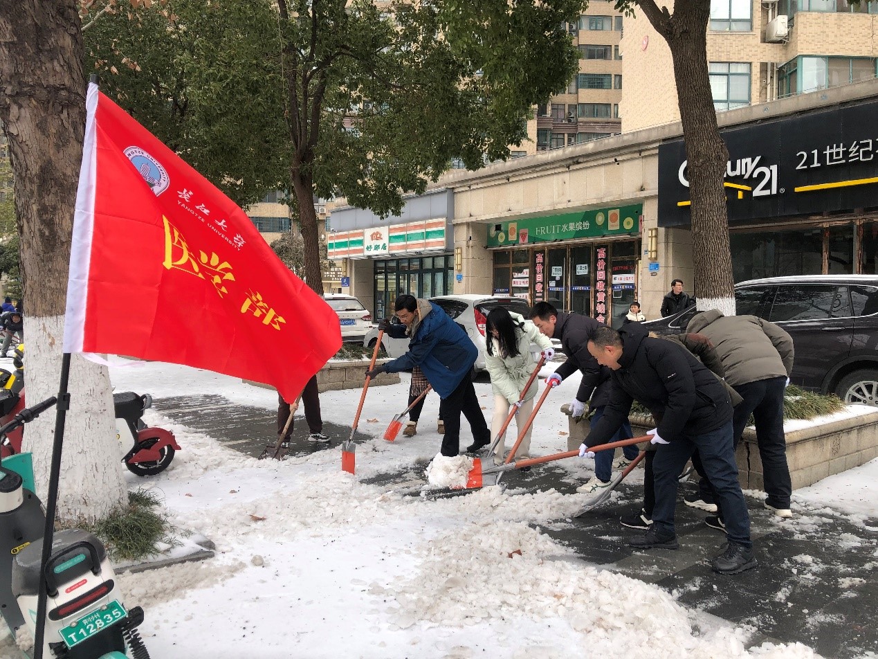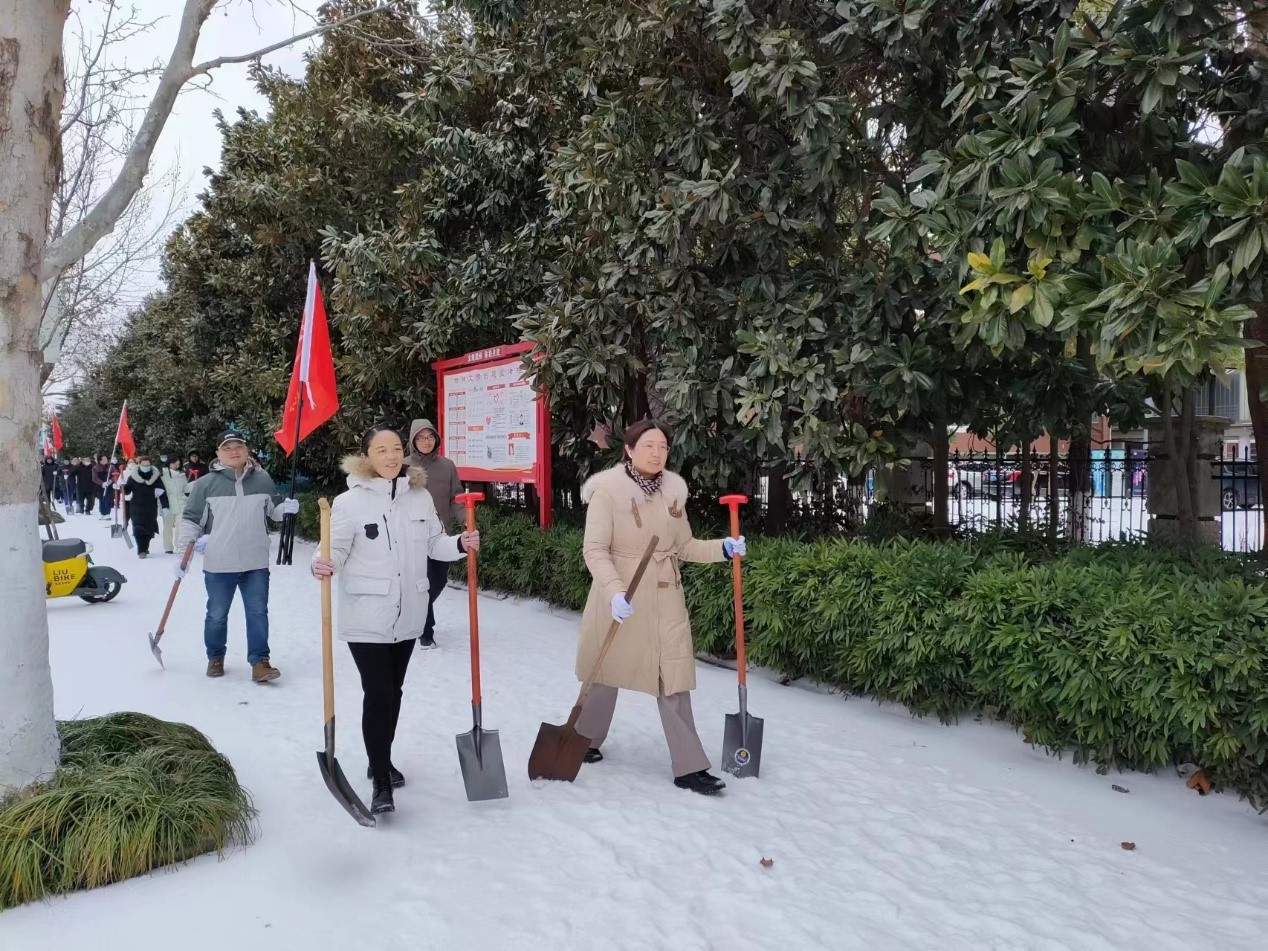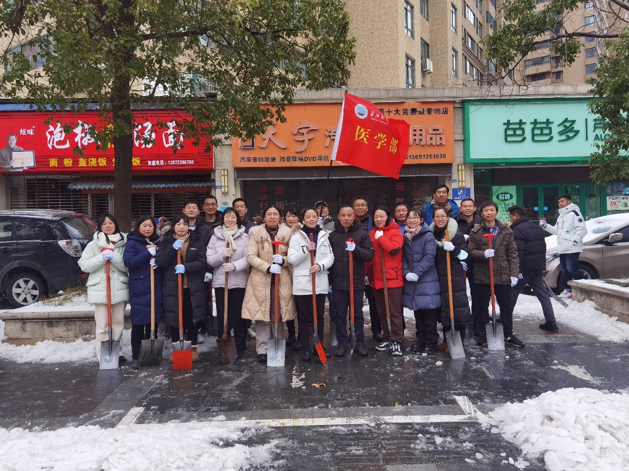 2月22日中午,为确保人民群众出行安全,医学部党委积极响应学校号召,迅速动员组织20余名党员干部,于长江尚品小区门口至大桥十字路口和东苑小区一带开展铲雪除冰工作。
