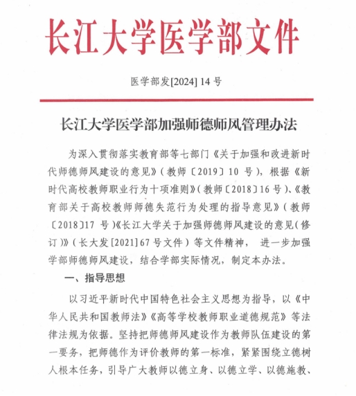 学部高度重视师德师风学习教育,坚持把师德师风建设作为教师队伍建设的第一要务,把师德作为评价教师的第一标准,成立师德师风领导小组,发布《长江大学医学部加强师德师风管理办法》[2024]14号文件并在每月教职工集中理论学习中开设师德师风专题,重点学习习近平总书记关于教师队伍建设的重要指示批示精神,引导广大教师以德立身、以德立学、以德施教、以德育德,自觉成为“学为人师、行为世范”的践行者、先进思想文化的传播者、党执政的坚定支持者和学生健康成长的指导者。同时,学部通过举办教师座谈会、谈心活动,了解教师的所思所想,引导广大教师重视师德养成,争当“四有”好老师。