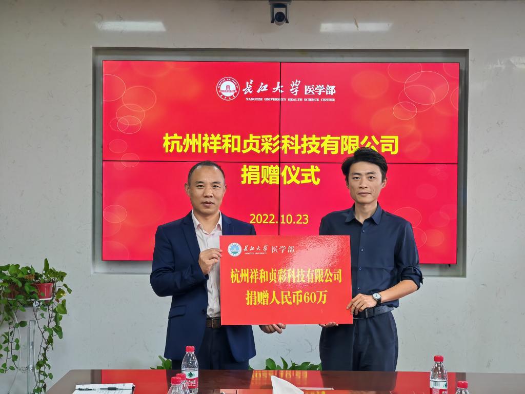 捐赠仪式上,医学部常务副部长龚权向杭州祥和贞彩科技有限公司负责人秦晓致欢迎辞,杭州祥和贞彩科技有限公司向长江大学医学部捐赠60万元支持医学教育发展,龚权代表医学部接受赠与。捐赠仪式结束后,所有参会人员现场合影留念。