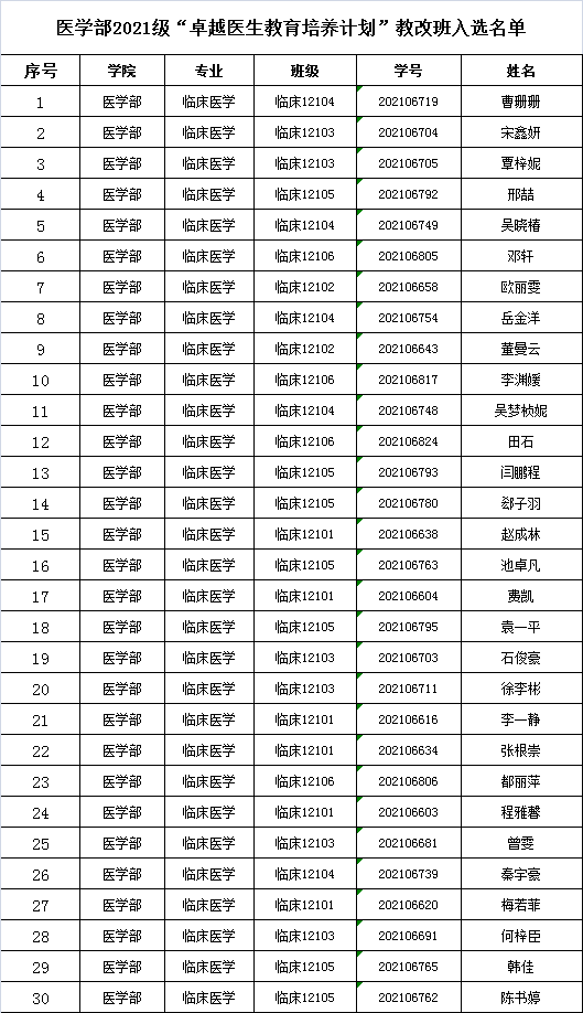 根据《长江大学医学部2021级“卓越医生教育培养计划”教改班学生选拔工作实施方案》的要求,医学部2020级临床医学专业共有125名同学进行了志愿申报,经过学籍审核、英语选拔考试、专家面试等综合评定,共30名学生入选2021级“卓越医生教育培养计划”教改班。现对入选名单进行公示(名单见附件),公示期三天。